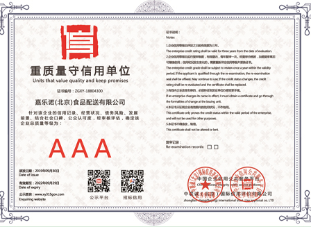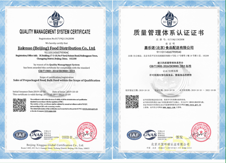 2012年通過ISO9001質(zhì)量管理體系認證、ISO14001環(huán)境管理體系認證、ISO45001職業(yè)健康與安全管理體系認證,三體系認證。2017年1月28日,嘉樂諾注冊認證商標審批成功。