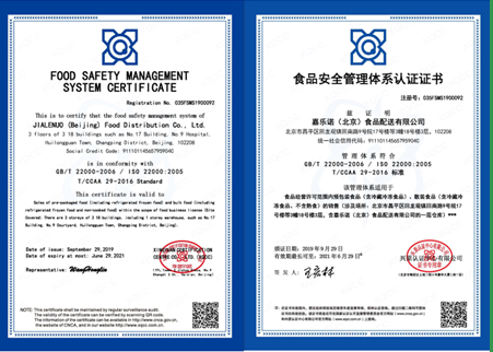 2019年通過ISO22000食品安全管理體系認證并嚴格按照改該管理體系安全標準執(zhí)行,并且我公司配送的食材由太平洋財險承保!