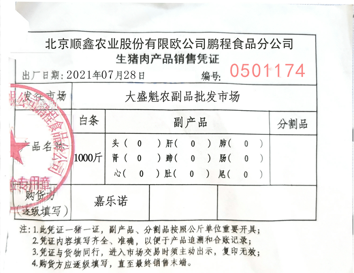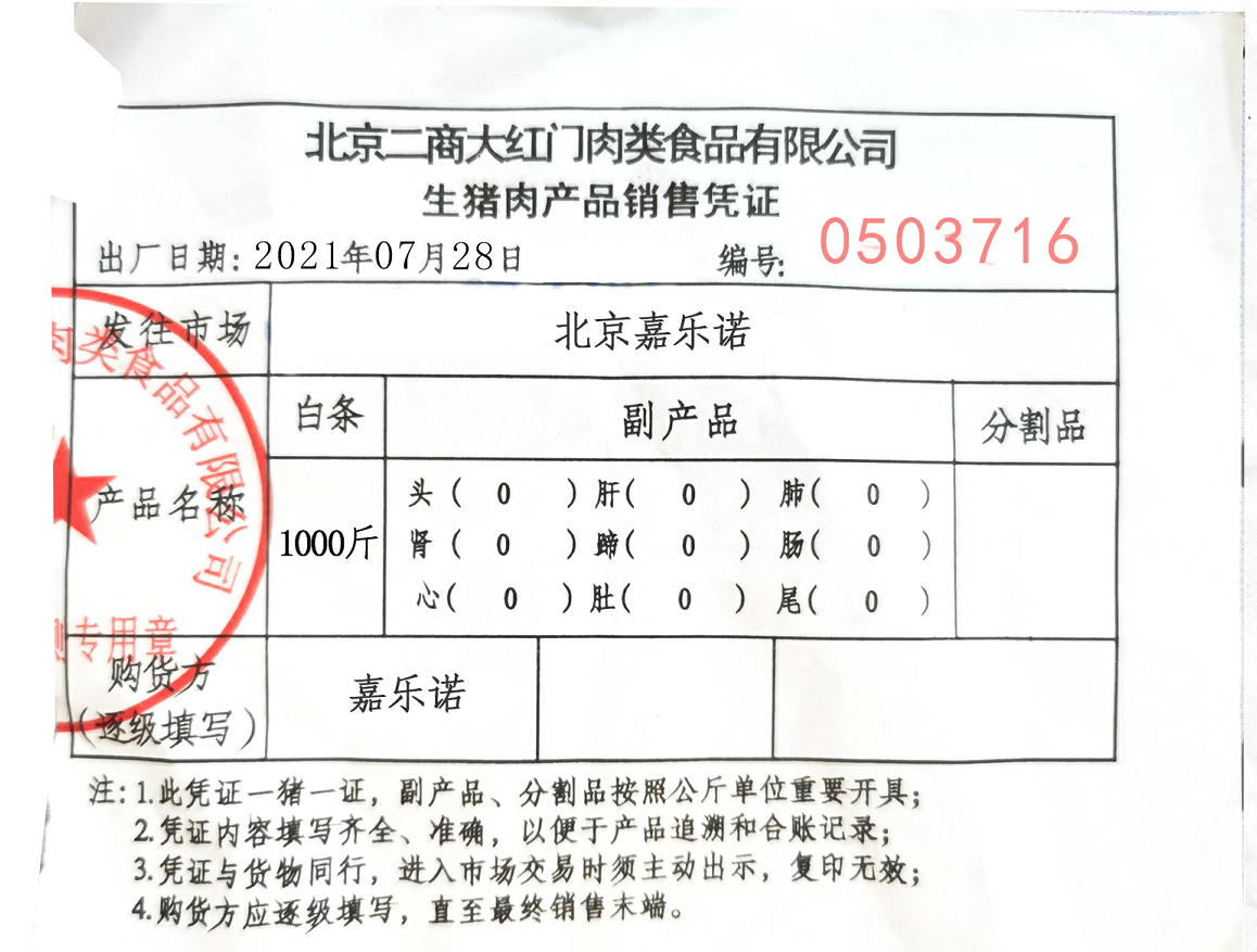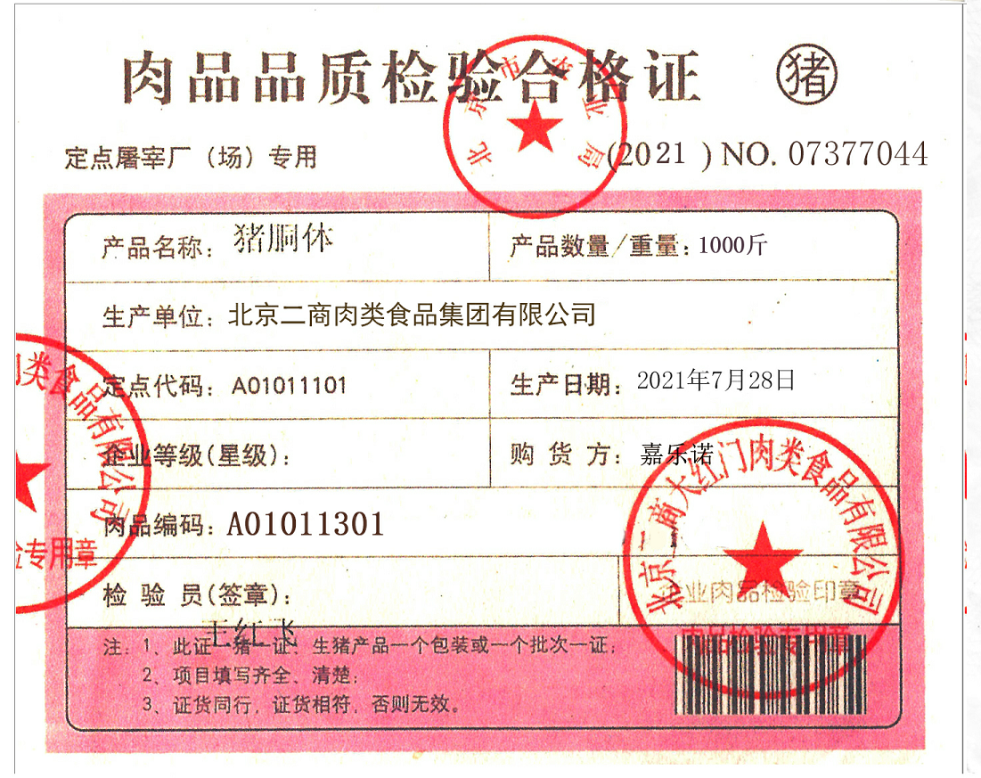 豬肉使用大紅門第五肉聯(lián)廠豬肉類,由五肉聯(lián)廠家在五肉聯(lián)廠內(nèi)進(jìn)行分割裝箱,箱體密封完整,箱外附有該批次豬肉出廠檢測(cè)證明。五肉聯(lián)冷藏車送至嘉樂(lè)諾馬上進(jìn)行冷藏銜接配送,